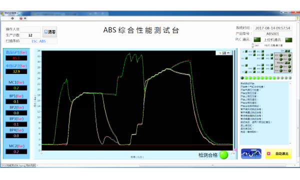 檢測臺由封堵夾具、測試系統(tǒng)、數(shù)據(jù)采集系統(tǒng)以及質(zhì)量追溯系統(tǒng)組成,配置有產(chǎn)品裝夾機構(gòu)、產(chǎn)品封堵及配氣機構(gòu)、產(chǎn)品配電機構(gòu)、氣壓測試系統(tǒng)、數(shù)據(jù)采集及分析系統(tǒng)等。測試臺采用高壓氮氣作為測試介質(zhì),改變傳統(tǒng)的制動液測試,減少制動液對產(chǎn)品及生產(chǎn)環(huán)境的影響。通過密封性測試、電磁閥響應測試、柱塞泵功能測試、蓄能器活塞測試等相關(guān)的部件功能測試和總成功能測試實現(xiàn)產(chǎn)品的性能判斷。