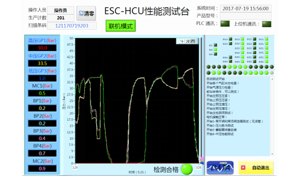 檢測(cè)臺(tái)由封堵夾具、測(cè)試系統(tǒng)、數(shù)據(jù)采集系統(tǒng)以及質(zhì)量追溯系統(tǒng)組成,配置有產(chǎn)品裝夾機(jī)構(gòu)、產(chǎn)品封堵及配氣機(jī)構(gòu)、產(chǎn)品配電機(jī)構(gòu)、氣壓測(cè)試系統(tǒng)、數(shù)據(jù)采集及分析系統(tǒng)等。測(cè)試臺(tái)采用高壓氮?dú)庾鳛闇y(cè)試介質(zhì),改變傳統(tǒng)的制動(dòng)液測(cè)試,減少制動(dòng)液對(duì)產(chǎn)品及生產(chǎn)環(huán)境的影響。通過密封性測(cè)試、電磁閥響應(yīng)測(cè)試、柱塞泵功能測(cè)試、蓄能器活塞測(cè)試等相關(guān)的部件功能測(cè)試和總成功能測(cè)試實(shí)現(xiàn)產(chǎn)品的性能判斷。